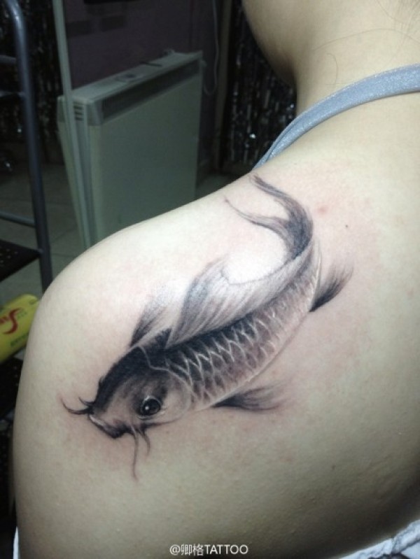 女生肩膀处小巧唯美的黑灰水墨鲤鱼纹身图案_鲤鱼纹身图案大全_纹身图吧