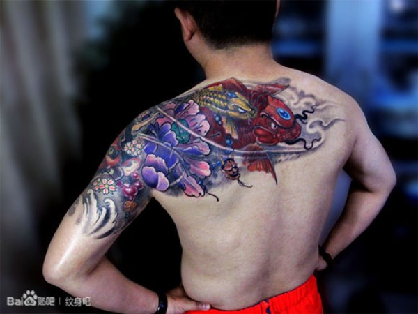 男人肩背唯美时尚的彩色鲤鱼莲花纹身图案_鲤鱼纹身图案大全_纹身图吧