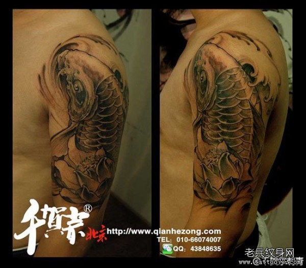 手臂时尚潮流的一款黑灰鲤鱼纹身图案_鲤鱼纹身图案大全_纹身图吧