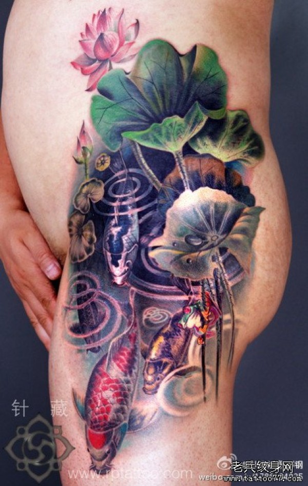 男人腿部经典的写实彩色鲤鱼莲花纹身图案_鲤鱼纹身图案大全_纹身图吧