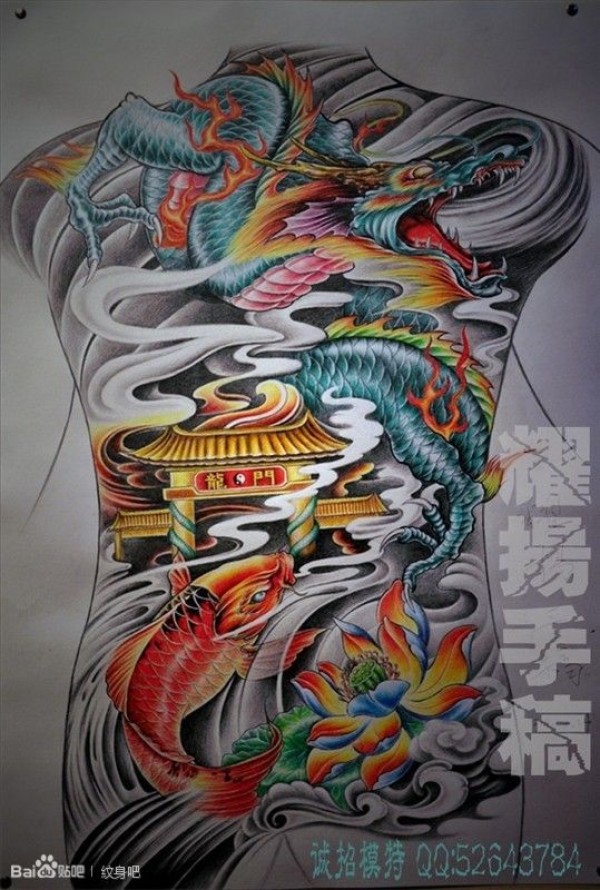 经典超酷的一款满背鲤鱼跃龙门纹身图案_鲤鱼纹身图案大全_纹身图吧