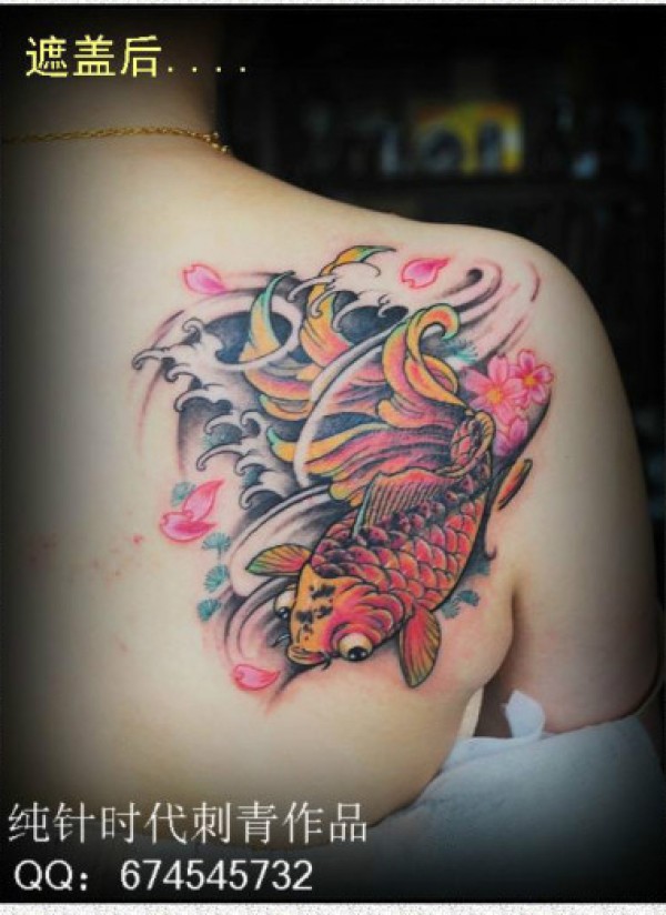女生后肩背漂亮的彩色小鲤鱼纹身图案_鲤鱼纹身图案大全_纹身图吧