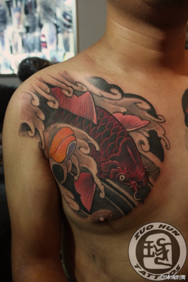 男人前胸经典潮流的传统彩色鲤鱼纹身图案_鲤鱼纹身图案大全_纹身图吧
