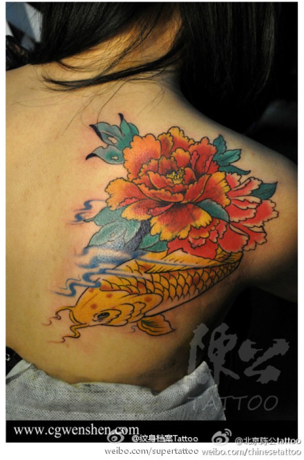 女生后背漂亮的彩色牡丹鲤鱼纹身图案_鲤鱼纹身图案大全_纹身图吧