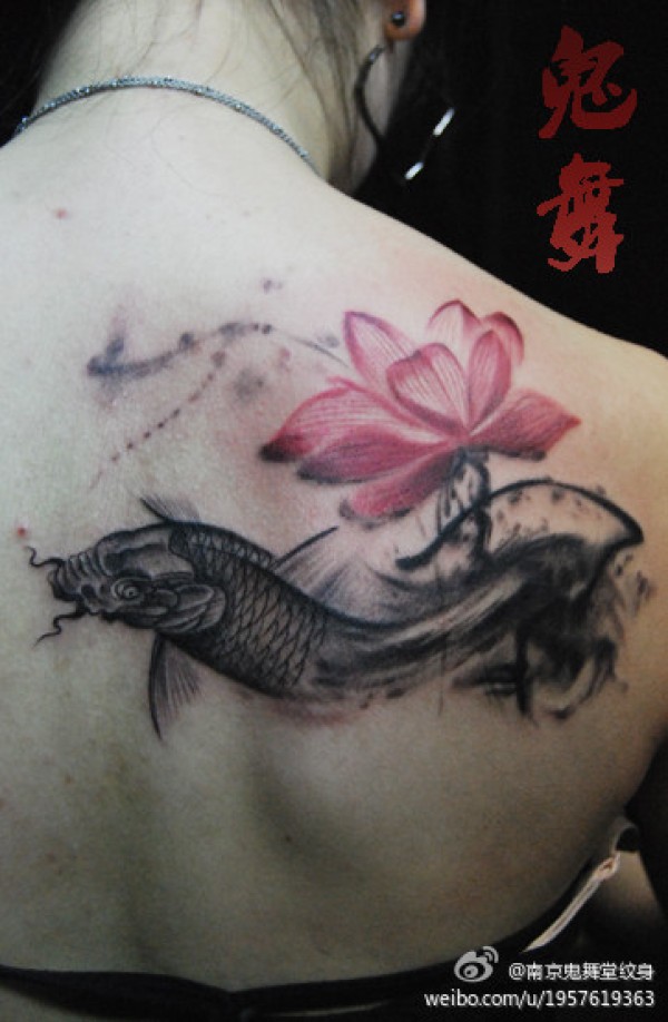 美女后背好看漂亮的水墨莲花鲤鱼纹身图案_鲤鱼纹身图案大全_纹身图吧
