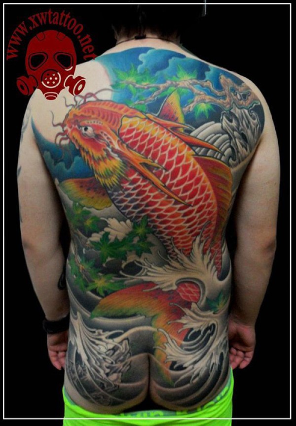 精艳好看的满背彩色鲤鱼纹身图案_鲤鱼纹身图案大全_纹身图吧