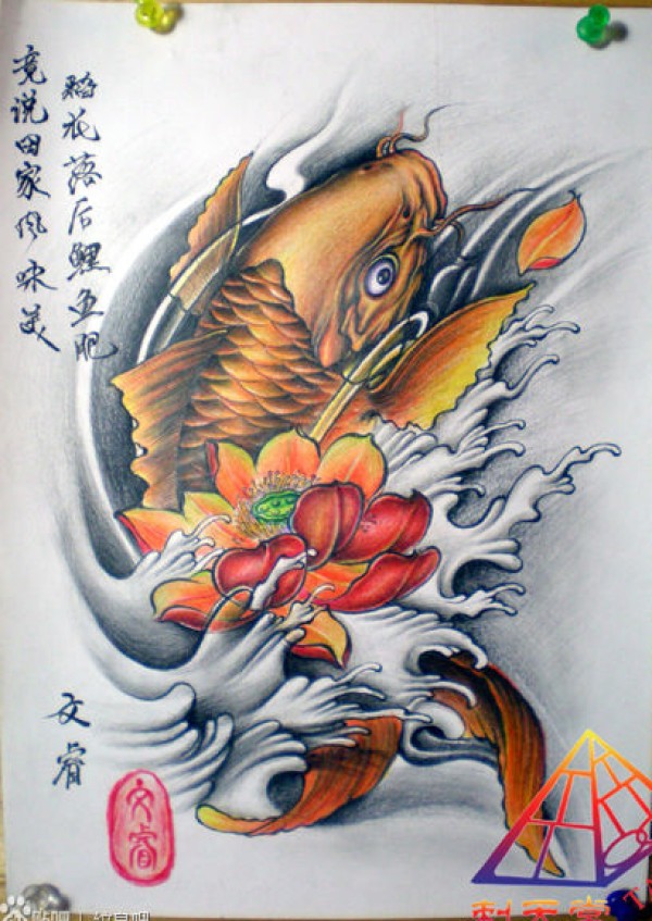 鲤鱼莲花纹身图案手稿_鲤鱼纹身图案大全_纹身图吧