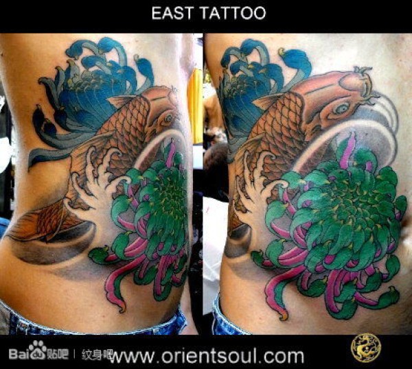 男人腰部经典流行的鲤鱼菊花纹身图案_鲤鱼纹身图案大全_纹身图吧