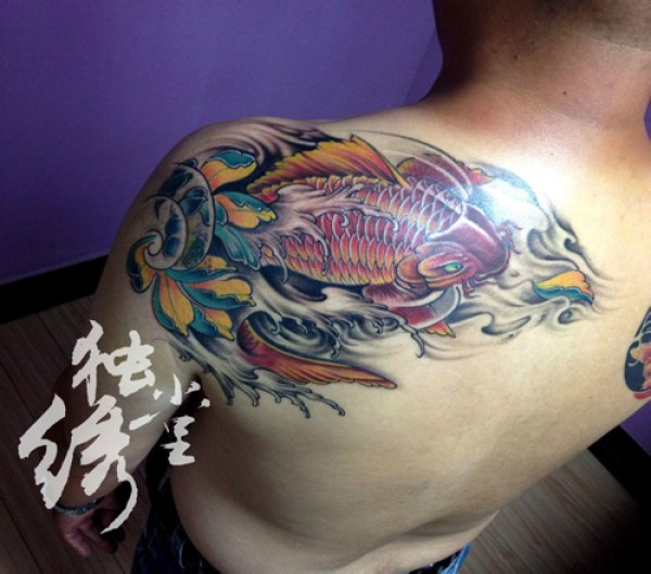 男人肩背漂亮时尚的彩色鲤鱼纹身图案_鲤鱼纹身图案大全_纹身图吧