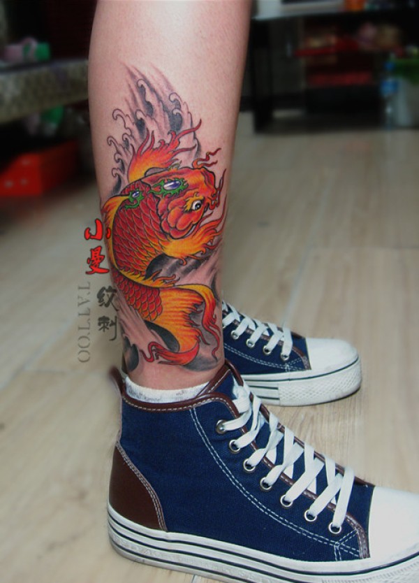 腿部漂亮的彩色鲤鱼纹身图案_鲤鱼纹身图案大全_纹身图吧
