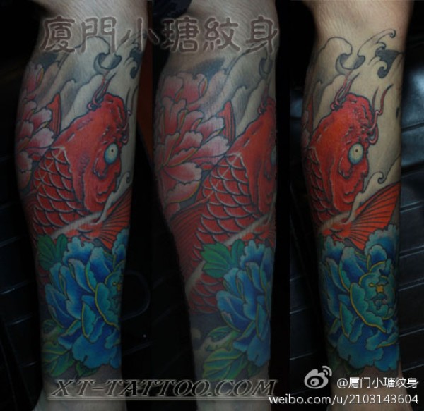 男人腿部唯美的传统鲤鱼牡丹纹身图案_鲤鱼纹身图案大全_纹身图吧