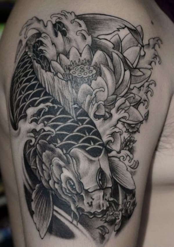 手臂唯美的黑白鲤鱼莲花纹身图案_鲤鱼纹身图案大全_纹身图吧