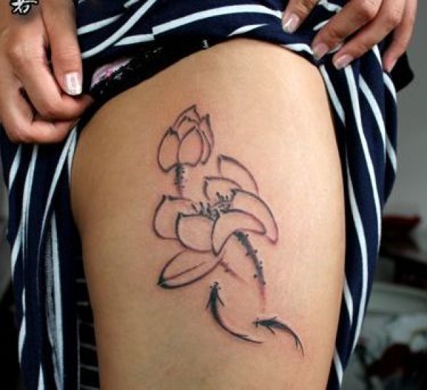 女孩子腿部水墨画风格莲花鲤鱼纹身图案_鲤鱼纹身图案大全_纹身图吧