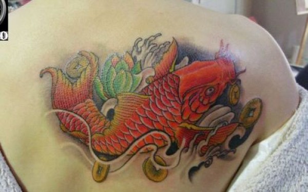 女孩子背部一款招财鲤鱼纹身图案_鲤鱼纹身图案大全_纹身图吧