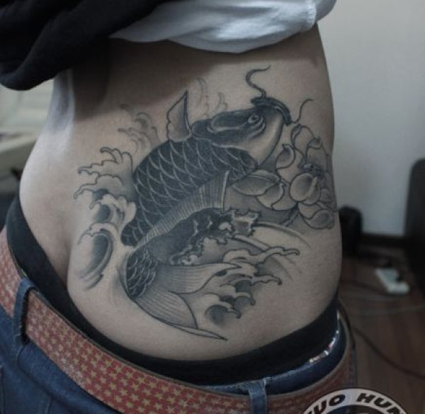 腰部精美的黑白鲤鱼莲花纹身图案_鲤鱼纹身图案大全_纹身图吧