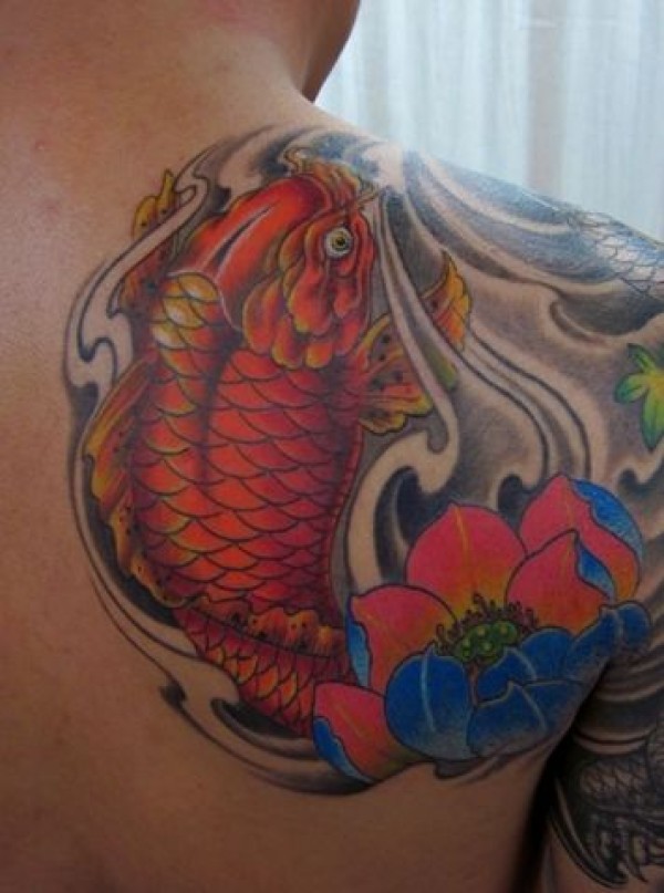 一款肩背彩色鲤鱼莲花纹身图案_鲤鱼纹身图案大全_纹身图吧
