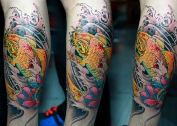 腿部彩色鲤鱼莲花纹身图案_鲤鱼纹身图案大全_纹身图吧