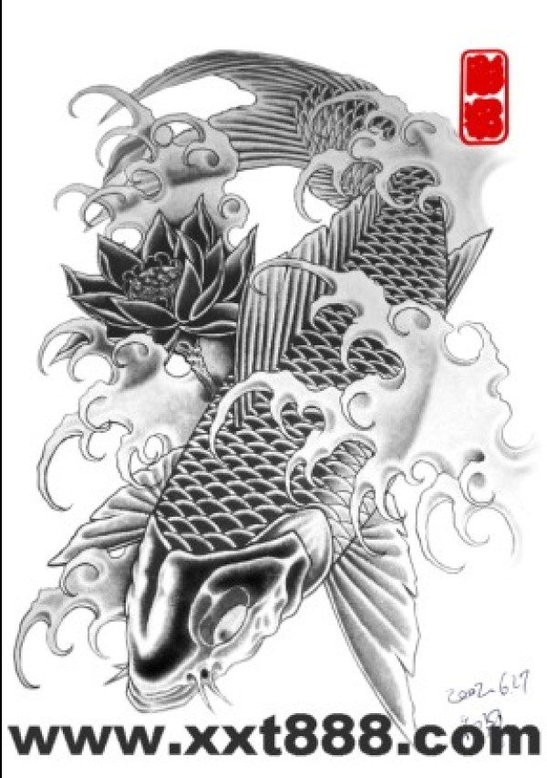 鲤鱼莲花纹身图案手稿_鲤鱼纹身图案大全_纹身图吧