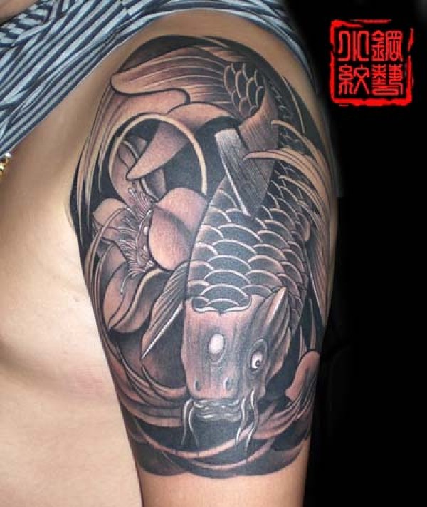 湖北恩施纹身店推荐一款大臂黑白传统鲤鱼莲花_鲤鱼纹身图案大全_纹身图吧