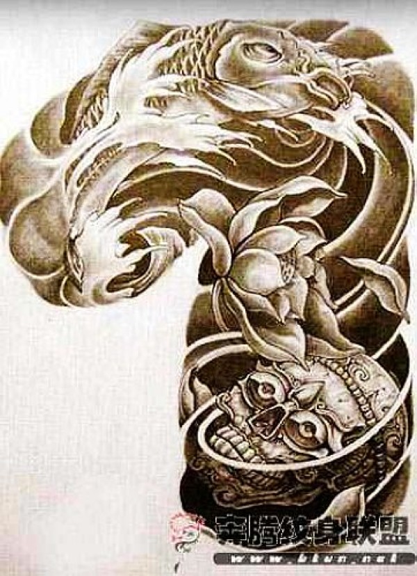 鲤鱼莲花纹身图案手稿_鲤鱼纹身图案大全_纹身图吧