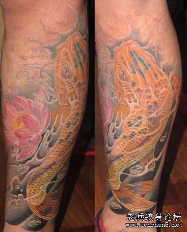 一款腿部3D彩色鲤鱼莲花纹身图案纹身图片_鲤鱼纹身图案大全_纹身图吧