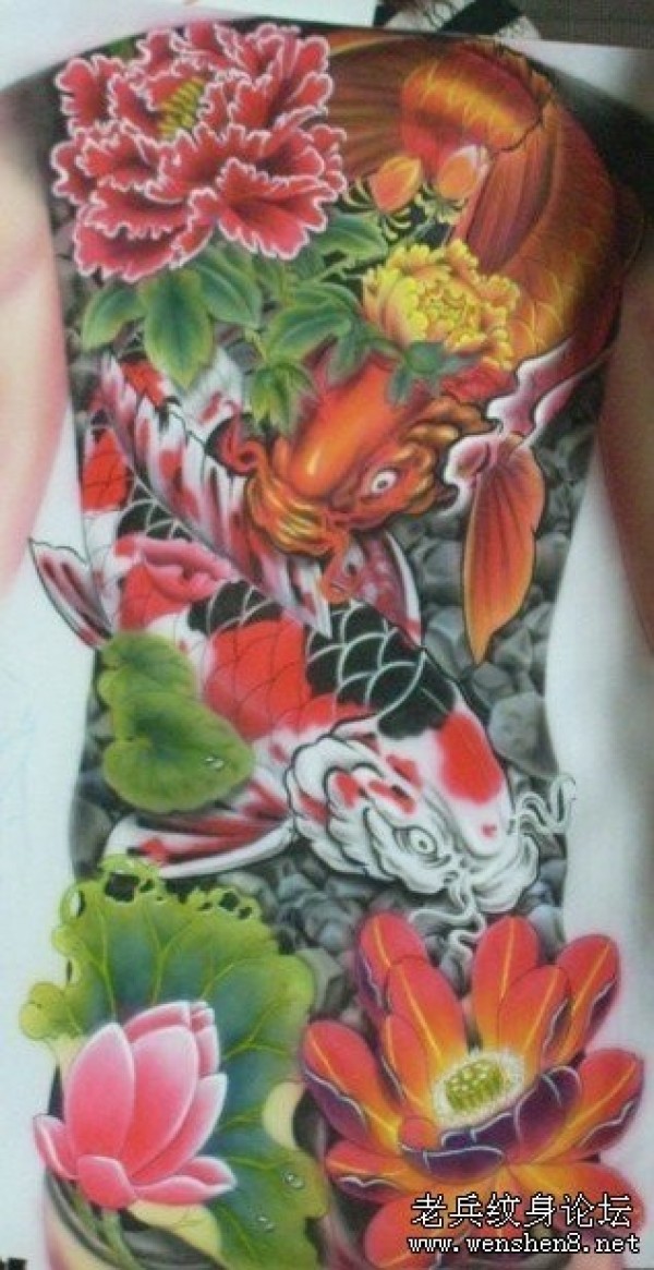 满背彩色鲤鱼莲花牡丹纹身图案纹身图片_鲤鱼纹身图案大全_纹身图吧