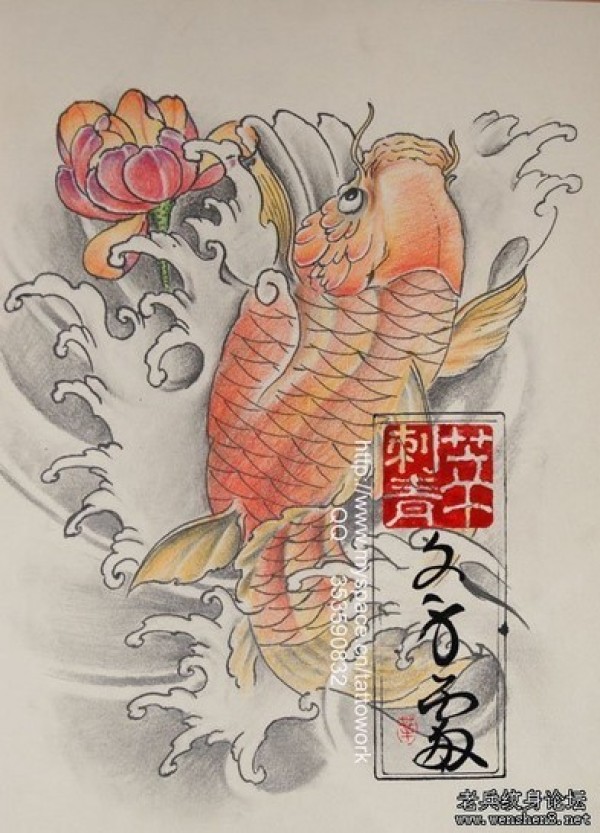 鲤鱼莲花纹身图案手稿_鲤鱼纹身图案大全_纹身图吧