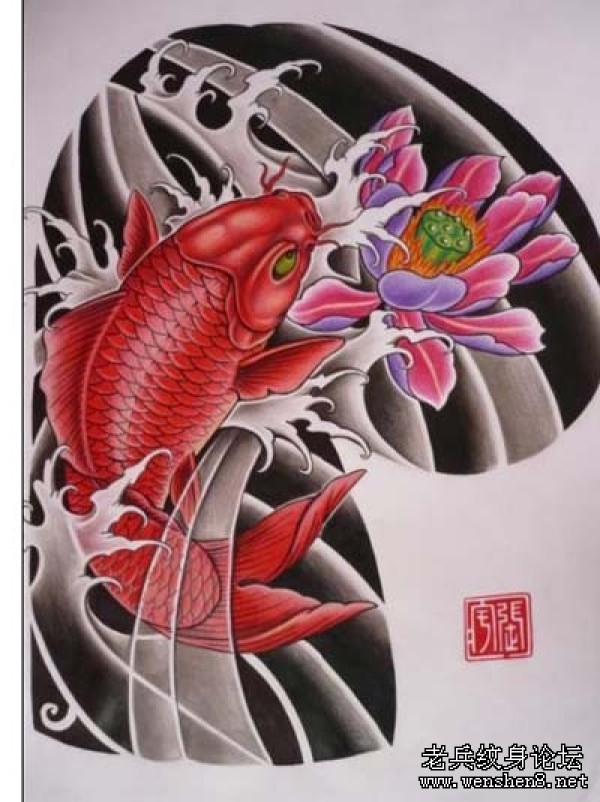 鲤鱼莲花纹身图案手稿_鲤鱼纹身图案大全_纹身图吧
