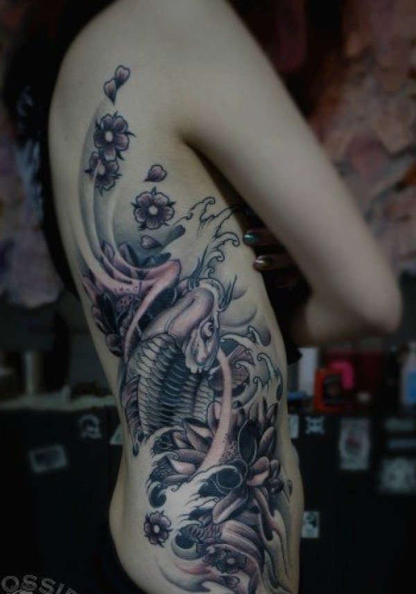 侧腰鲤鱼莲花纹身_鲤鱼纹身图案大全_纹身图吧