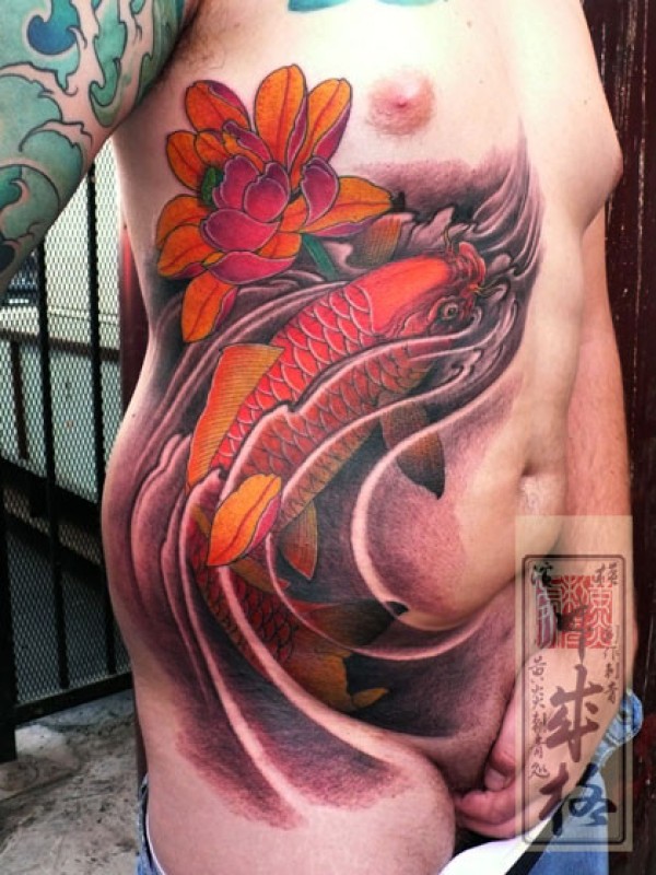 侧腰鲤鱼莲花纹身_鲤鱼纹身图案大全_纹身图吧
