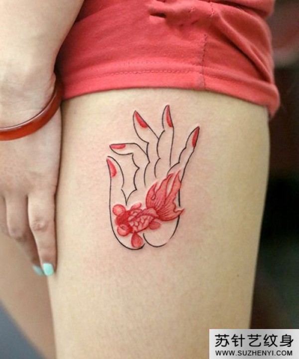佛手红色鲤鱼大腿纹身_鲤鱼纹身图案大全_纹身图吧