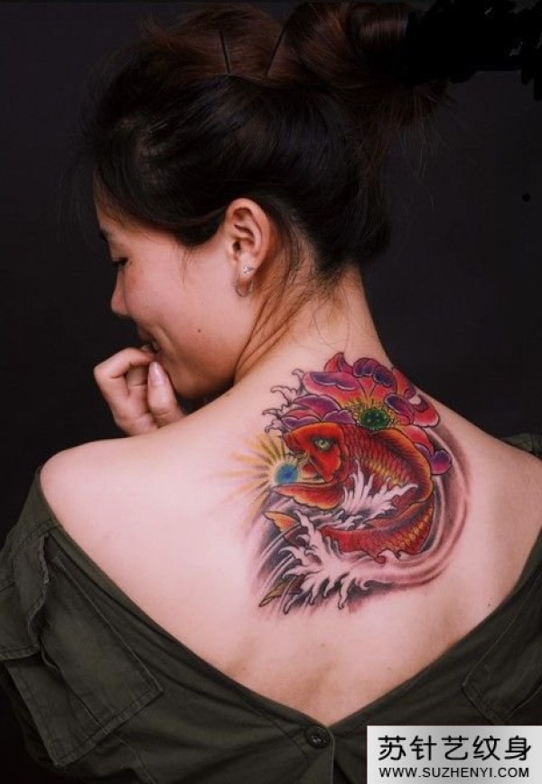 女孩背部彩色完美的鲤鱼莲花纹身_鲤鱼纹身图案大全_纹身图吧