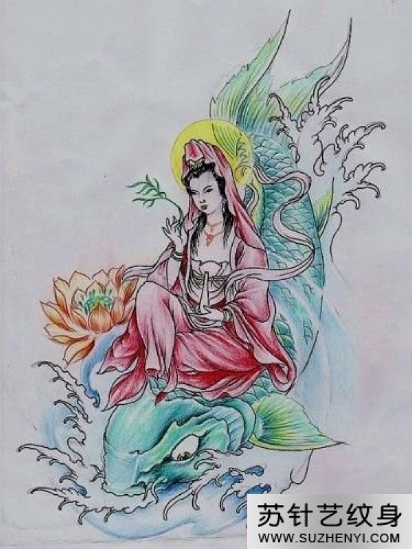 彩色鲤鱼莲花观音纹身图案手稿_鲤鱼纹身图案大全_纹身图吧