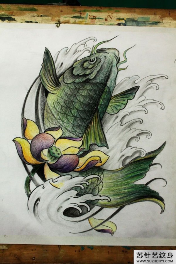 鲤鱼莲花纹身图案手稿_鲤鱼纹身图案大全_纹身图吧