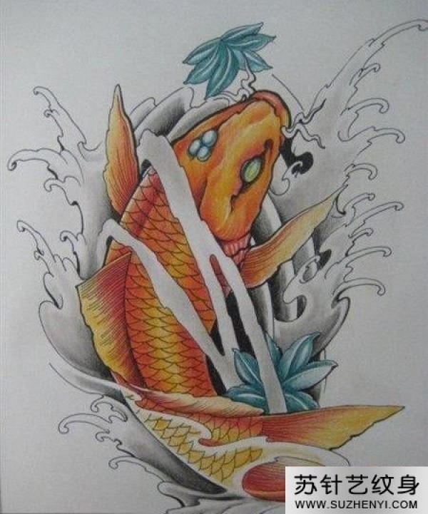 时尚彩色鲤鱼跃龙门纹身手稿_鲤鱼纹身图案大全_纹身图吧
