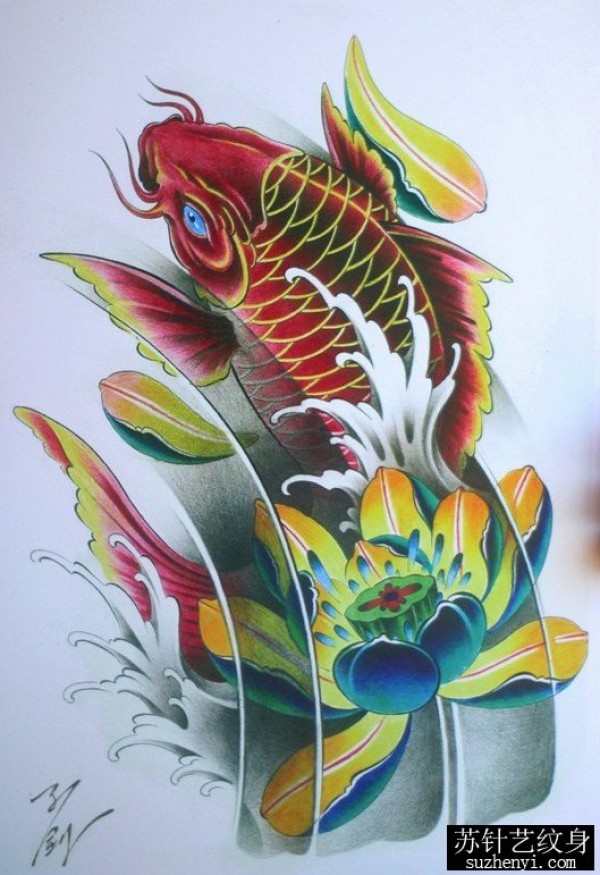 彩色鲤鱼莲花_鲤鱼纹身图案大全_纹身图吧