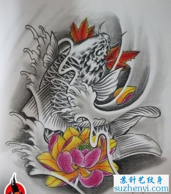 彩色鲤鱼莲花枫叶纹身图案纹身手稿_鲤鱼纹身图案大全_纹身图吧