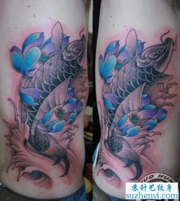 侧腰鲤鱼莲花纹身_鲤鱼纹身图案大全_纹身图吧