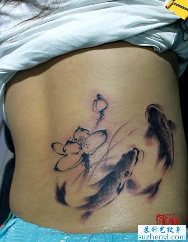 腰部水墨风格鲤鱼莲花纹身_鲤鱼纹身图案大全_纹身图吧