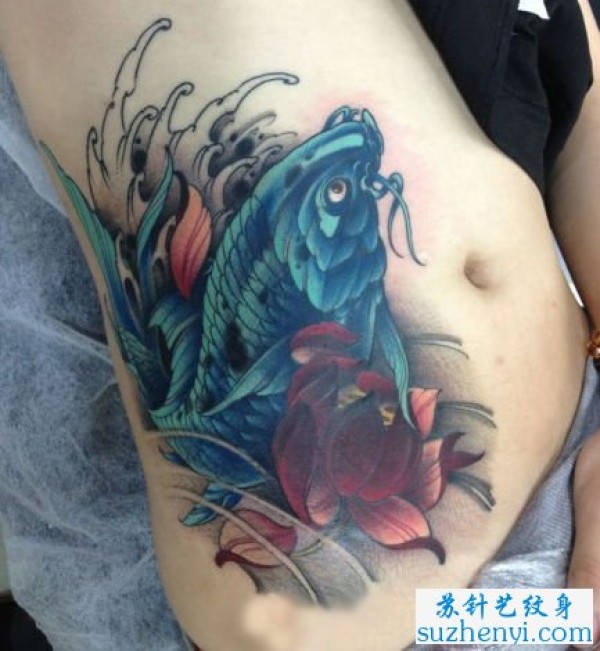 侧腰鲤鱼莲花纹身_鲤鱼纹身图案大全_纹身图吧
