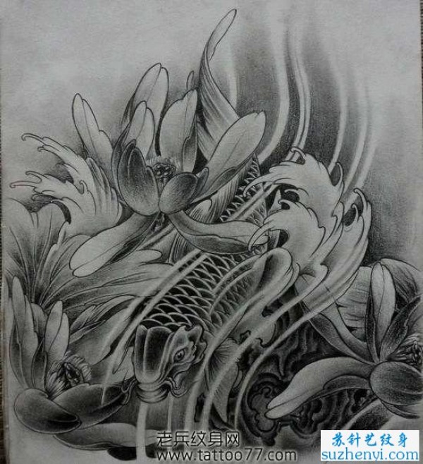 鲤鱼莲花纹身图案手稿_鲤鱼纹身图案大全_纹身图吧