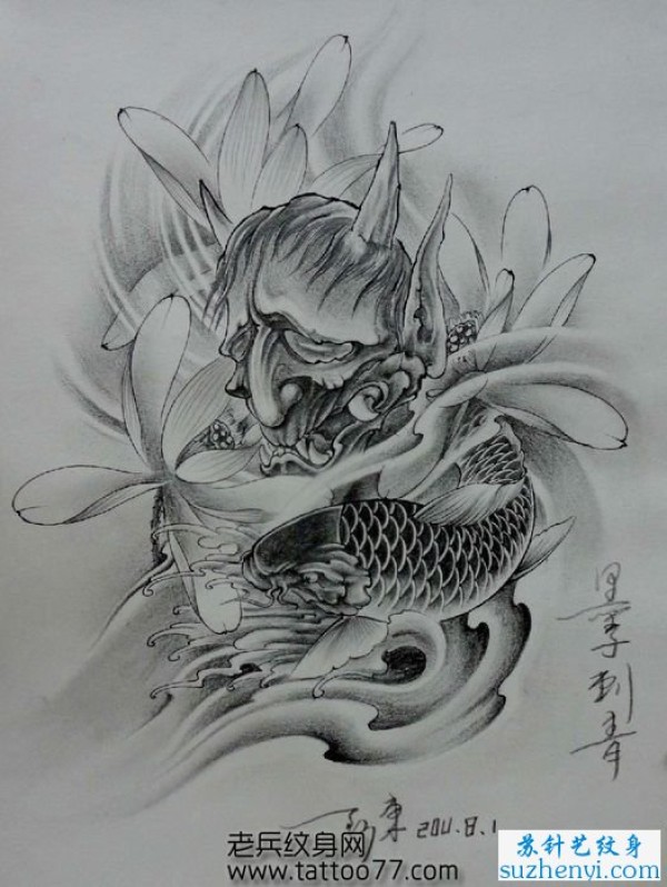鲤鱼莲花纹身图案手稿_鲤鱼纹身图案大全_纹身图吧
