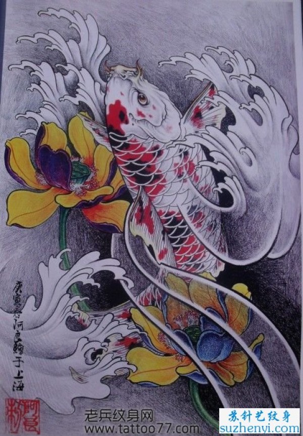 鲤鱼莲花纹身图案手稿_鲤鱼纹身图案大全_纹身图吧