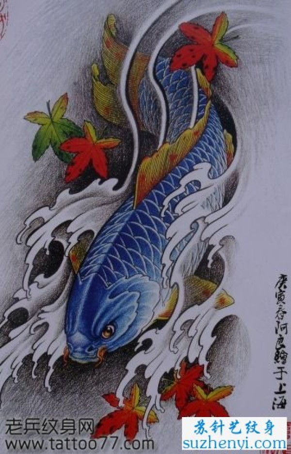 枫叶鲤鱼纹身手稿_鲤鱼纹身图案大全_纹身图吧