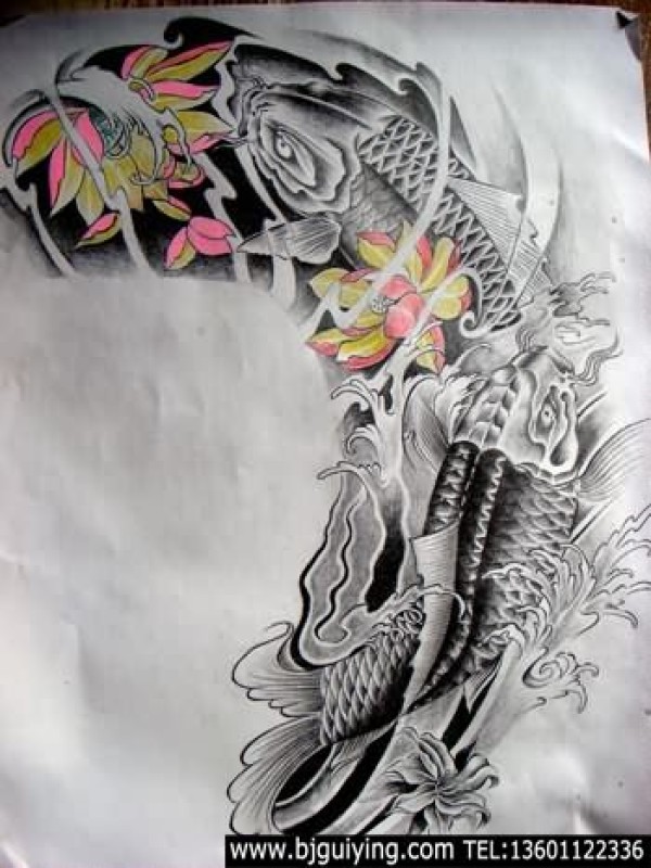 鲤鱼莲花纹身图案手稿_鲤鱼纹身图案大全_纹身图吧