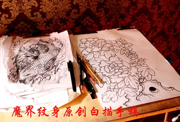 魔界手稿牡丹鲤鱼白描_鲤鱼纹身图案大全_纹身图吧