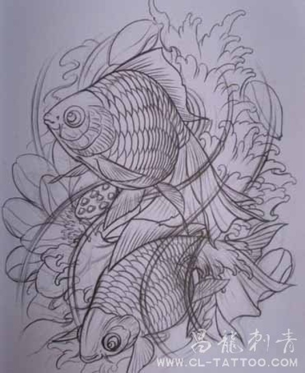 鲤鱼莲花纹身图案手稿_鲤鱼纹身图案大全_纹身图吧