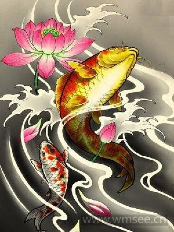 荷花鲤鱼彩色纹身手稿_鲤鱼纹身图案大全_纹身图吧