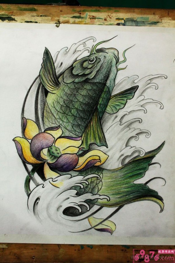 鲤鱼莲花纹身图案手稿_鲤鱼纹身图案大全_纹身图吧