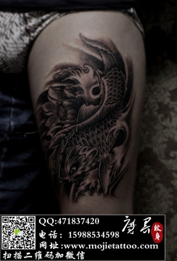 大腿黑灰鲤鱼纹身_鲤鱼纹身图案大全_纹身图吧